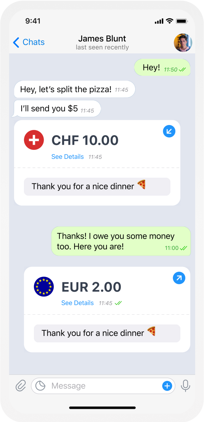 Nutzen sie Ihr Bankkonto oder Ihre Kreditkarte, um mit einem Klick Guthaben aufzuladen oder Geld abzuheben. Währungen kaufen und verkaufen geht direkt im Chat.